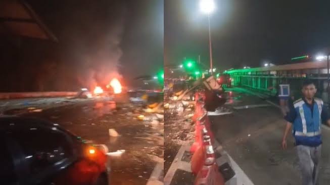 Peristiwa mengerikan yang ini diduga dipicu oleh sebuah truk bermuatan galon yang mengalami rem blong. Truk yang melaju kencang ini menghantam beberapa kendaraan di gerbang tol.