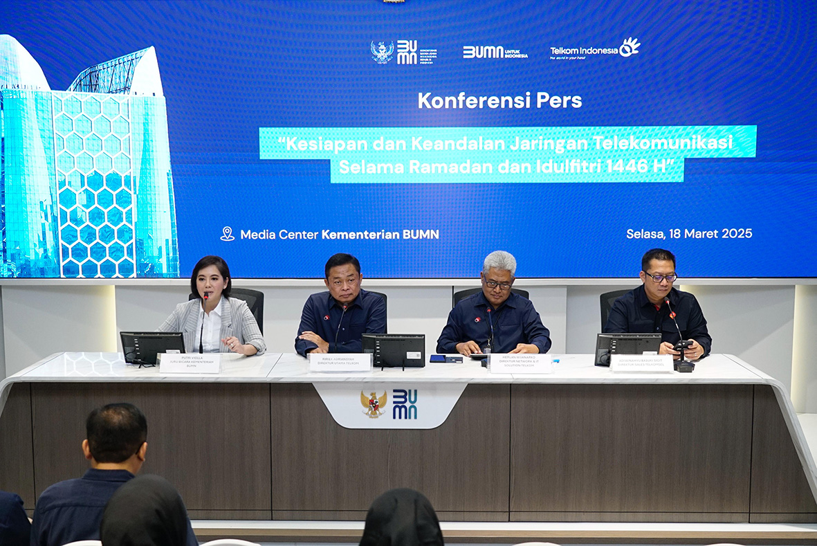 Saat Konferensi Pers Kesiapan TelkomGroup dalam rangka Ramadan dan Idulfitri (RAFI) 2025/1446H di Kementerian BUMN RI, pada Selasa (18/3), Direktur Utama Telkom Ririek Adriansyah menyampaikan,