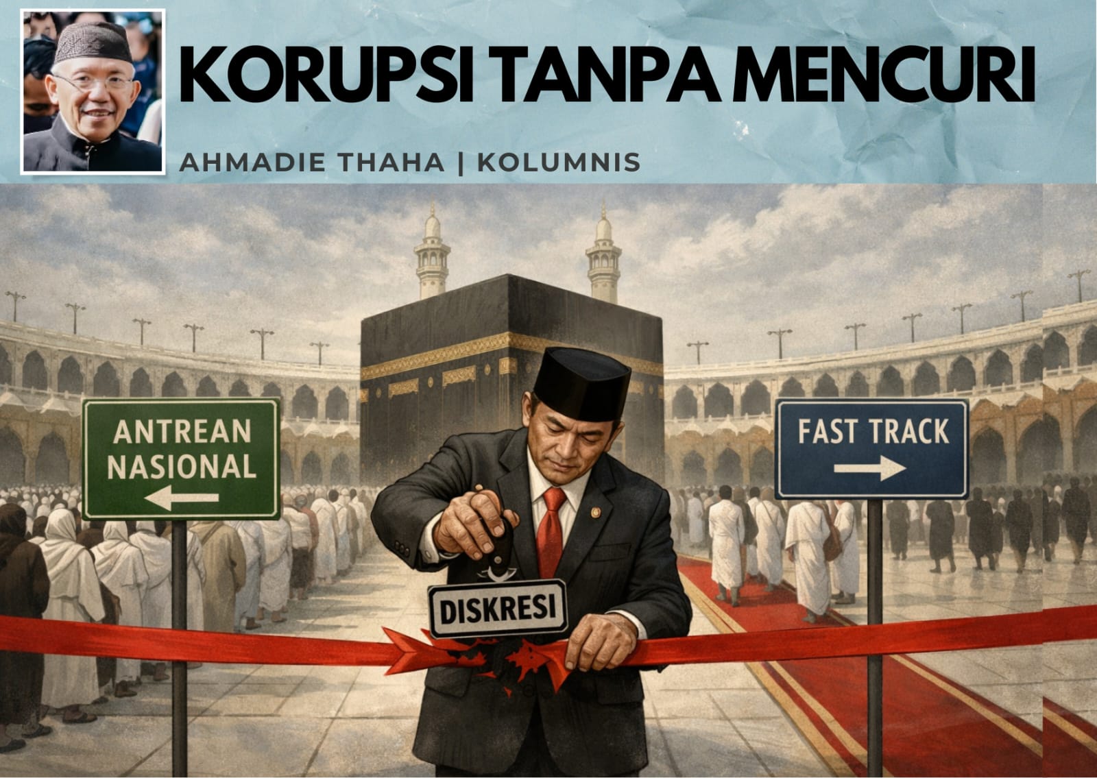 Korupsi tidak selalu mencuri uang jamaah; ia lebih canggih — mengomersialkan kewenangan. Dan justru di sinilah bahayanya: ketika hukum ditenangkan dengan istilah “diskresi”, sementara keadilan sosial diam-diam dikorbankan.