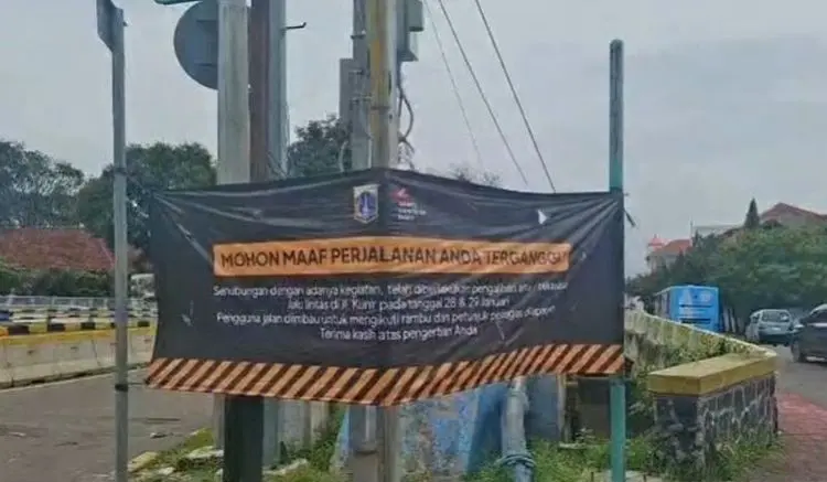 Dalam spanduk berlogo Pemprov DKI Jakarta dan Jakarta Experience Board tertulis permohonan maaf kepada para pengguna jalan karena akses di Jalan Kunir pada 28 dan 29 Januari 2026 dialihkan.