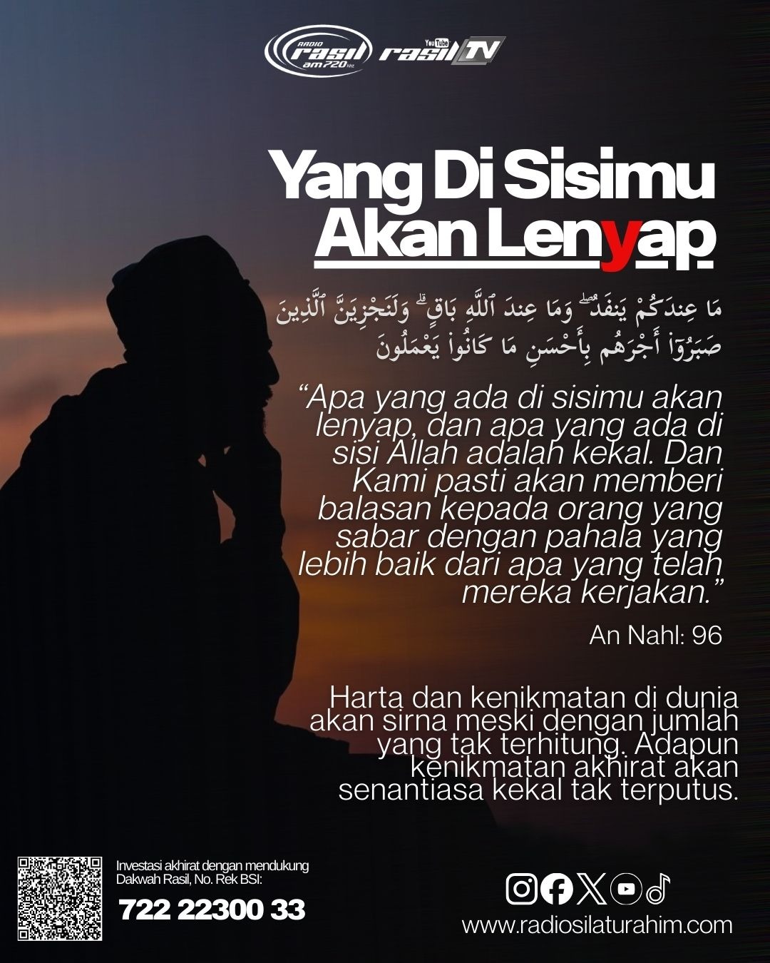 Ayat ini menegaskan perbedaan kontras antara materi duniawi yang bersifat temporal (fana) dengan simpanan ukhrawi yang bersifat abadi. Secara psikologis, ayat ini mengajak kita untuk tidak terlalu terpaku pada kehilangan atau kepemilikan di dunia, karena segala sesuatu yang kita anggap “milik kita” pada akhirnya akan sirna.
