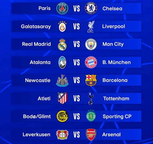 Juara bertahan Paris Saint-Germain akan ditantang Chelsea, sementara Real Madrid akan meladeni Manchester City. Adapun Sporting bakal bertemu dengan kuda hitam Bodo/Glimt.