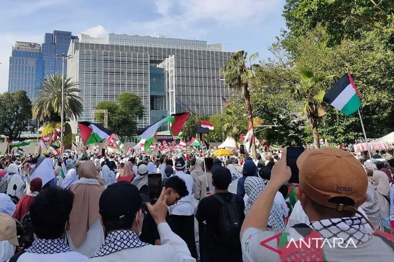 ABNnews–Aksi digelar Ribuan warga di depan Kedutaan Besar Amerika Serikat (AS) untuk Indonesia, Jakarta Pusat, Minggu pagi, sebagai bentuk belasungkawa terhadap tiga personel TNI yang gugur di Lebanon Selatan saat menjalankan misi perdamaian PBB.