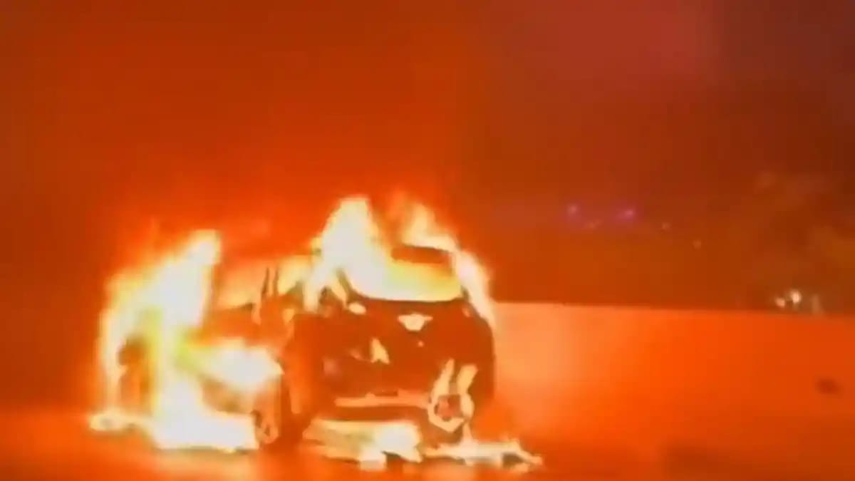 Dalam video yang beredar, nampak kendaraan yang diduga jenis Mitsubishi Xpander tersebut dilalap api seuruhnya.