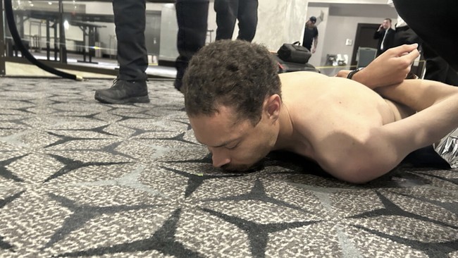 Dalam foto tersebut, pelaku terlihat bertelanjang dada dan dalam posisi tengkurap di atas karpet. Kedua tangannya diborgol di punggung, sementara petugas keamanan berjaga ketat tepat di belakangnya.